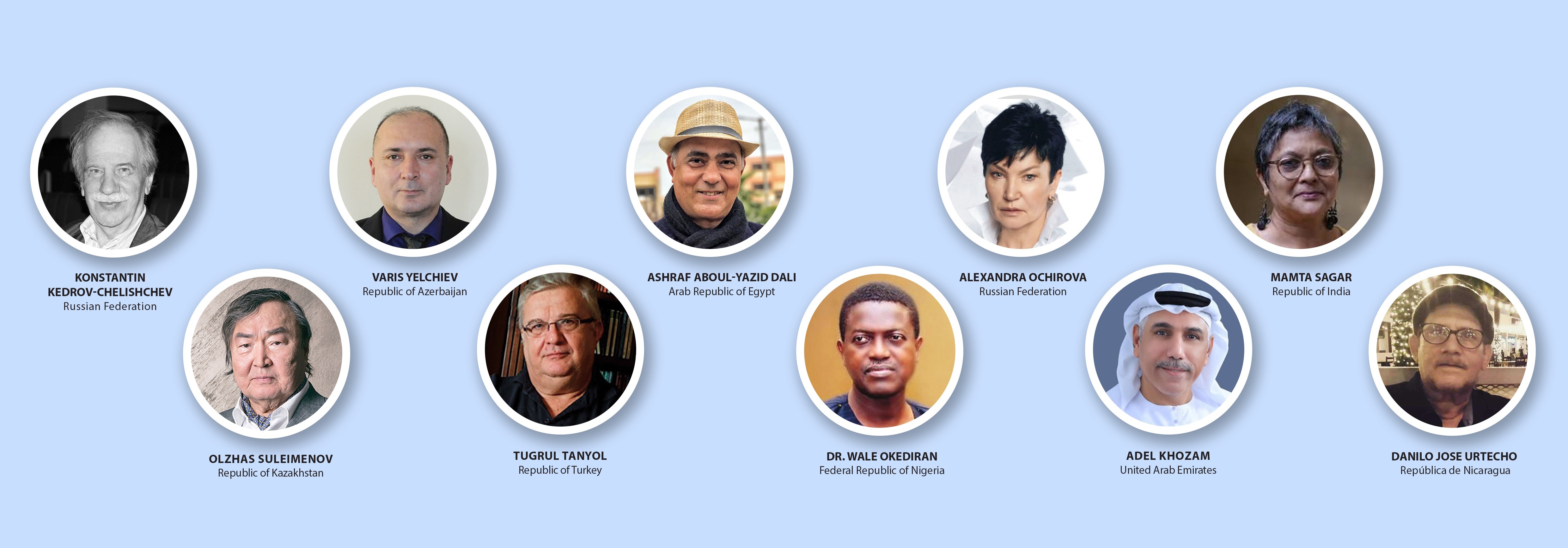 Высший литературный Совет: Нобелевский Лауреат писатель Акинванде Воле Бабатунде Шойинка (Нигерия), Лауреат премии Манхэ поэт Ко Ын (Южная Корея); Президент WOW Маргарита Аль, Лауреаты Премии “WOW”: Константин Кедров (Россия), Олжас Сулейменов (Казахстан), Варис Елчиев (Азербайджан), Тугрул Танйол (Турция), Ашраф Дали (Египет), Wale Okediran (Нигерия), Александра Очирова (РФ) Adel Khazam (ОАЭ)