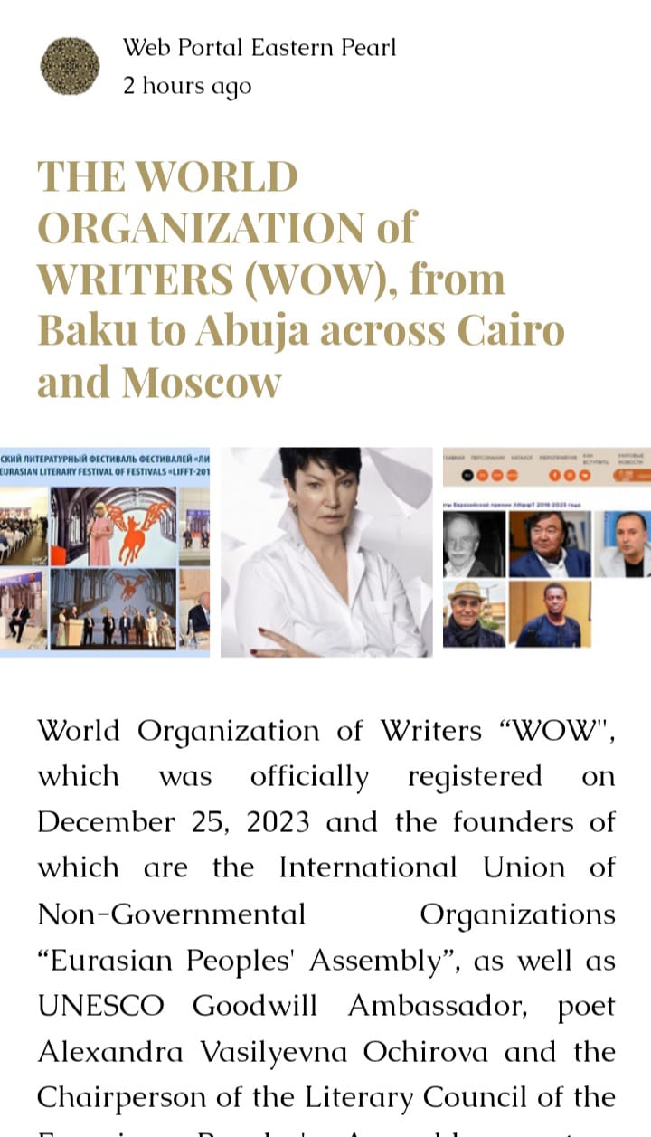 Поздравление от Всемирной организации писателей (WOW) и литературного Совета Ассамблеи народов мира!
